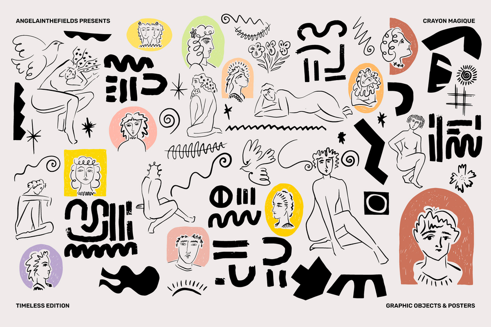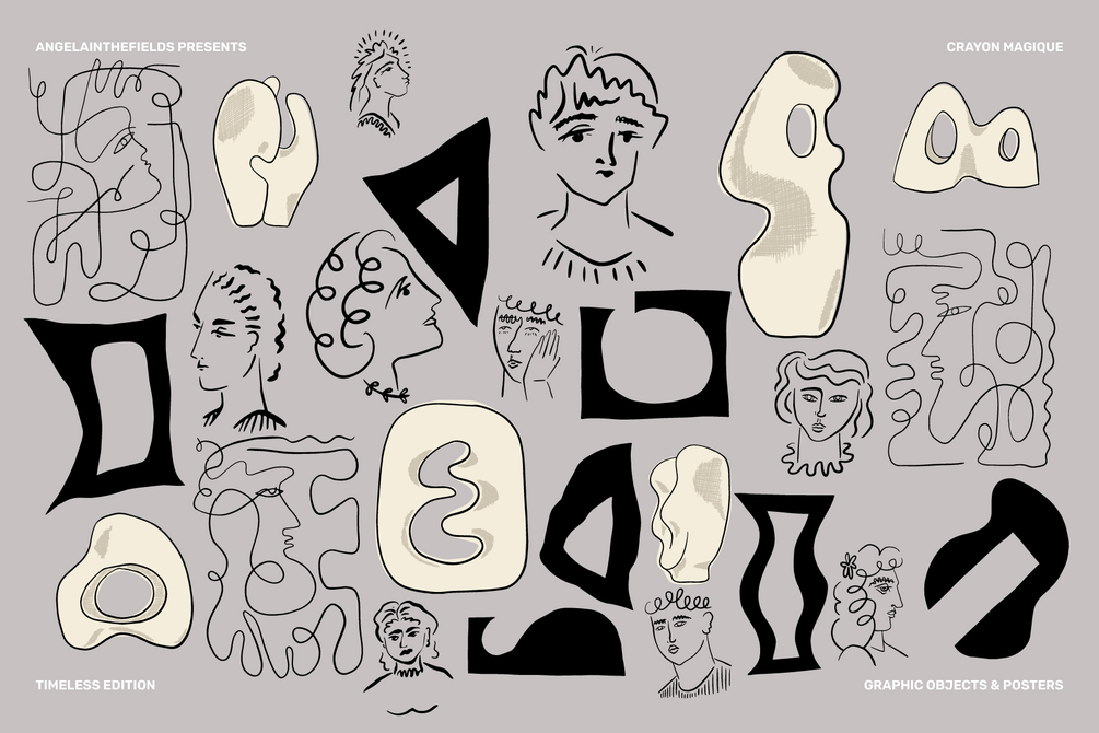 Collating and meshing the style of Picasso, Jean Arp, Matisse, Henry Moore and their contemporaries, this set is a comprehensive collection of portraits, doodles, wonky geos and florals. There are also 36 premade posters which you can use for wall art or merch as well as 8 colour palettes to match the style and give you a unique product by recolouring. Bonus to the pack are scanned high resolution paper textures which will give you a layer deeper on achieving this look.