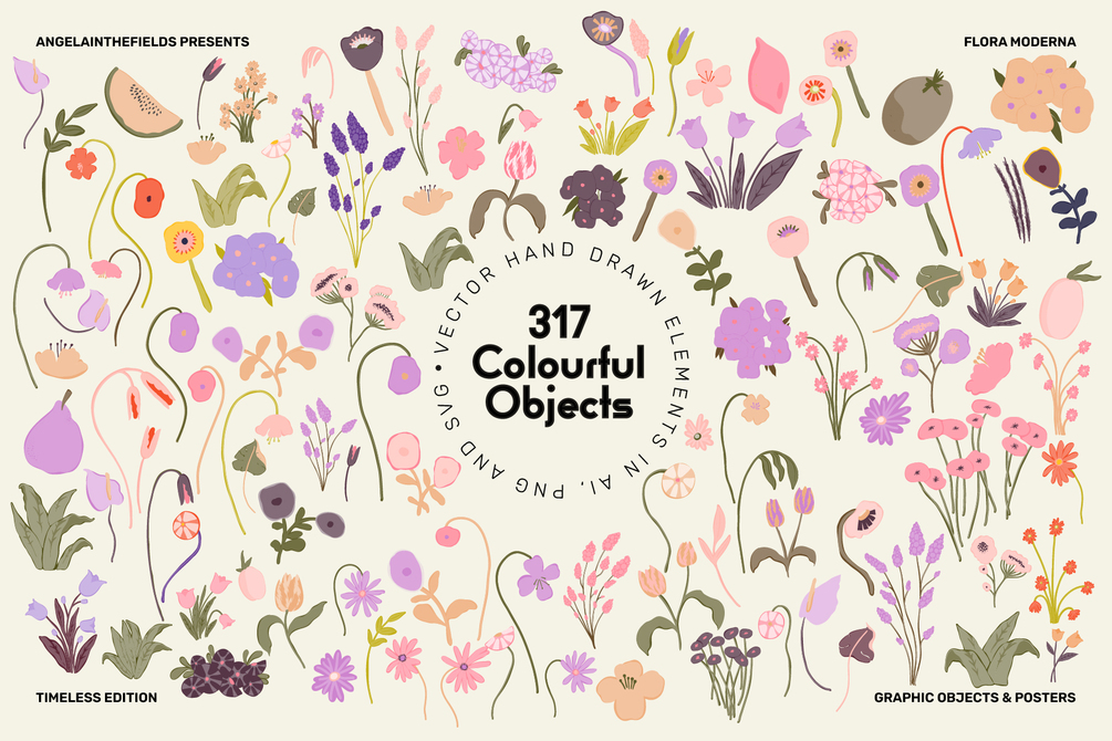 The romantic notion of spring florals mixes with painterly shapes, wonky lines and carefully chosen colourways. Perfect for building your own posters, branding, social media templates and more.
