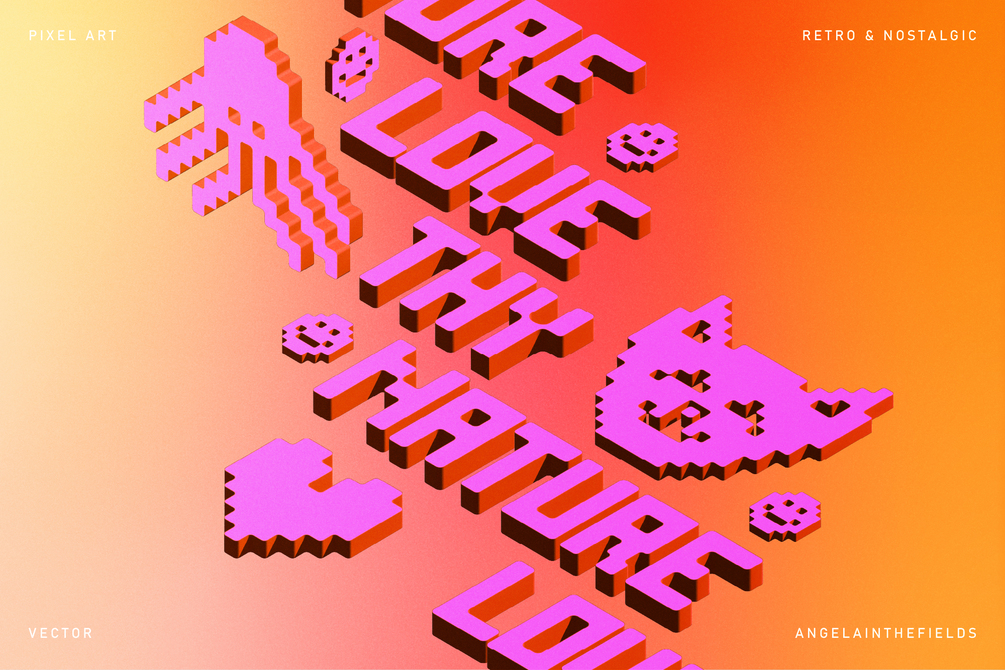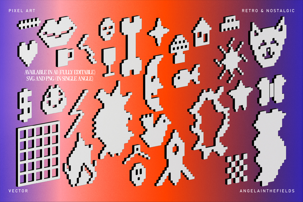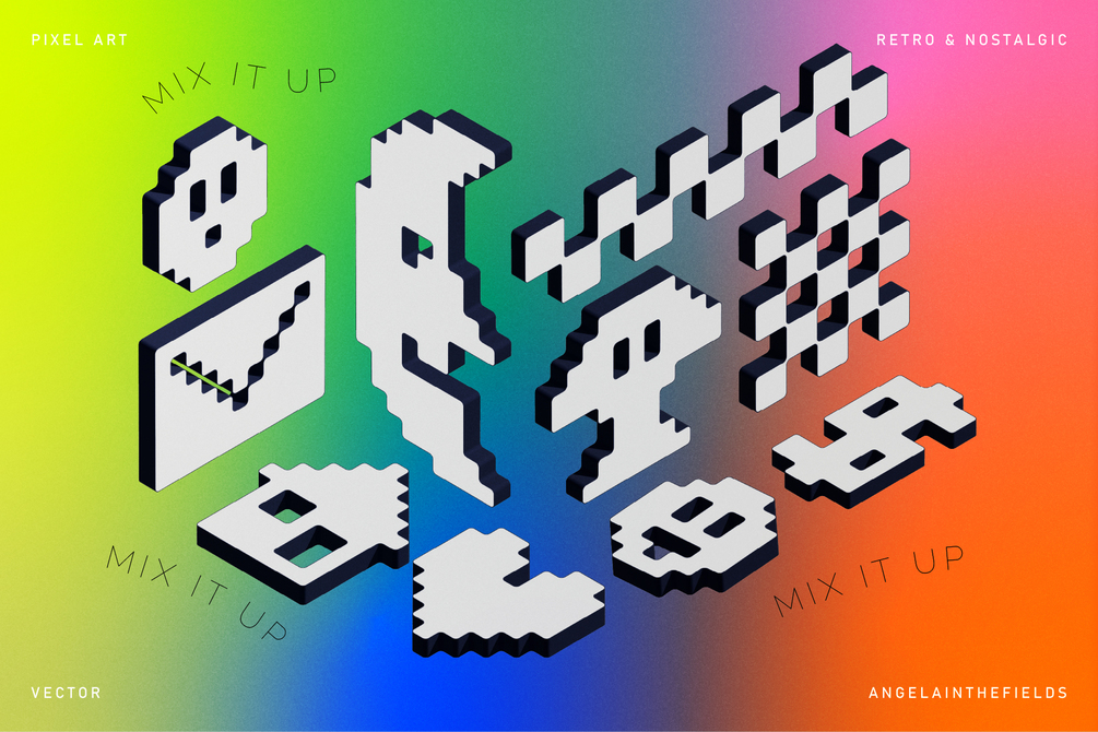 Harking back to our favourite games of our childhoods, this clipart set will put a smile on your face. Fully editable (in Adobe Illustrator), you can change fills, strokes, edges, angles and add Materials - the options are endless! A go to product when you're putting together any kind of retro futurist or postmodern projects, you're bound to have oodles of fun using it.