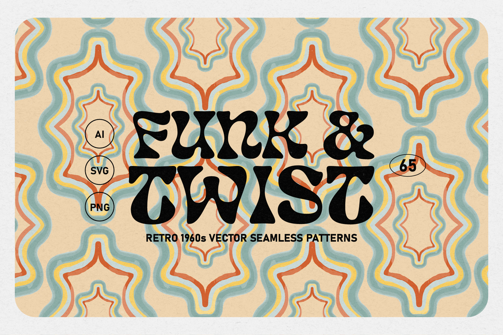 Get groovy with these swinging sixties-inspired patterns, featuring retro wallpaper designs with a modern twist. Inject a touch of nostalgia into your projects while keeping them trendy and contemporary. Perfect for posters, groovy packaging, retro-inspired stationery, and more! Easily customize colors and resize patterns using the included 'all-in-one' AI file.