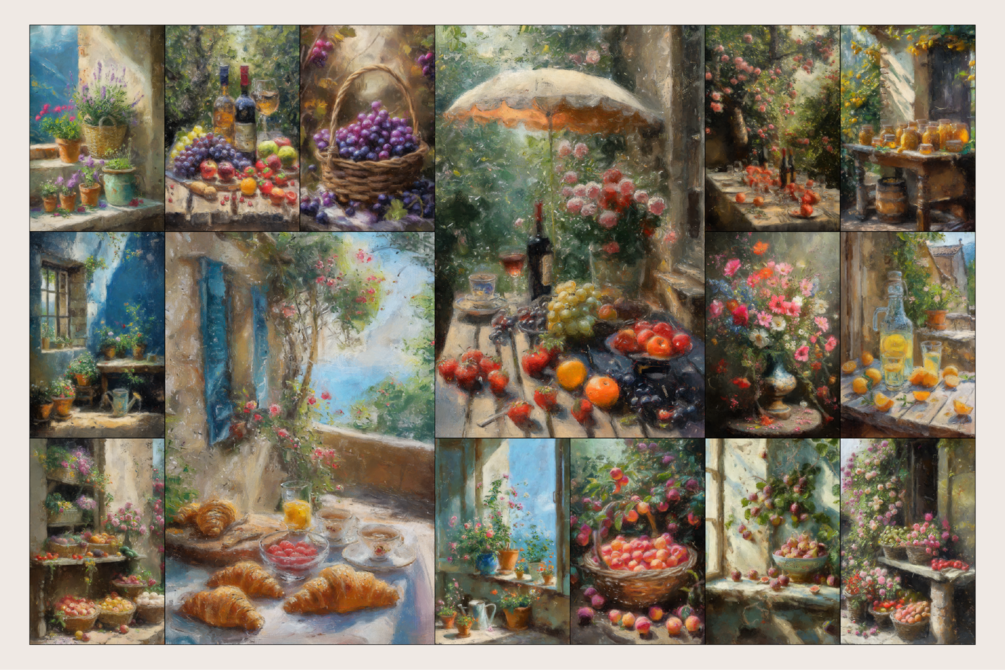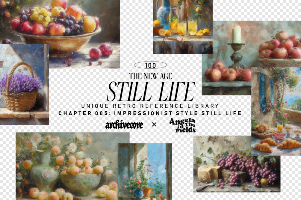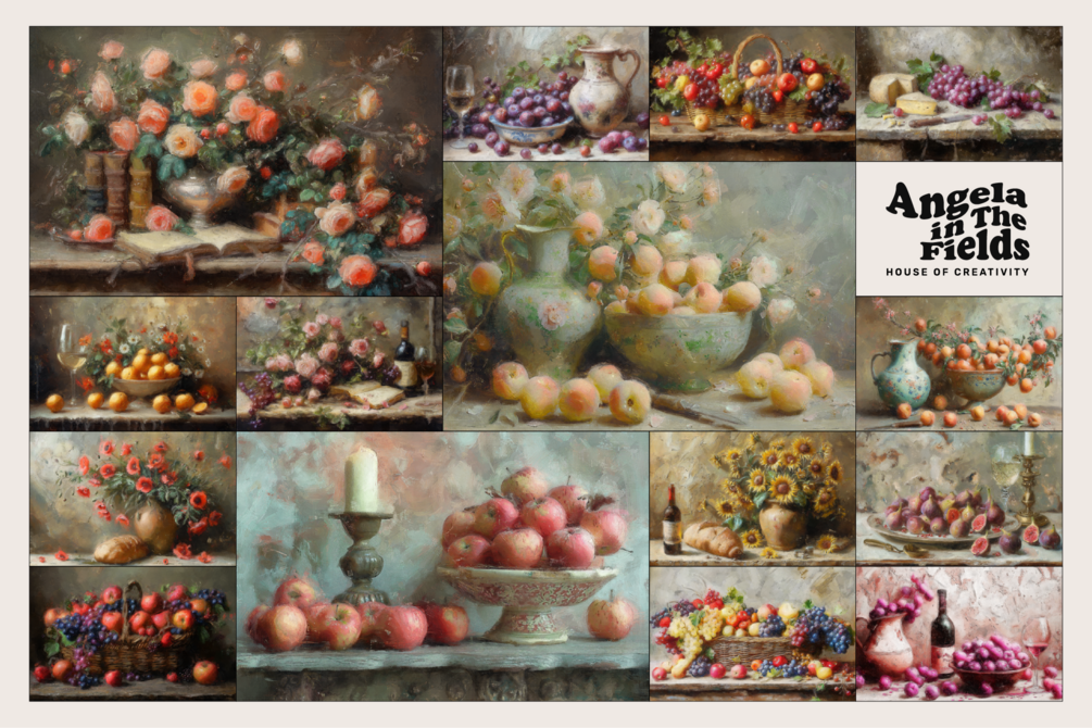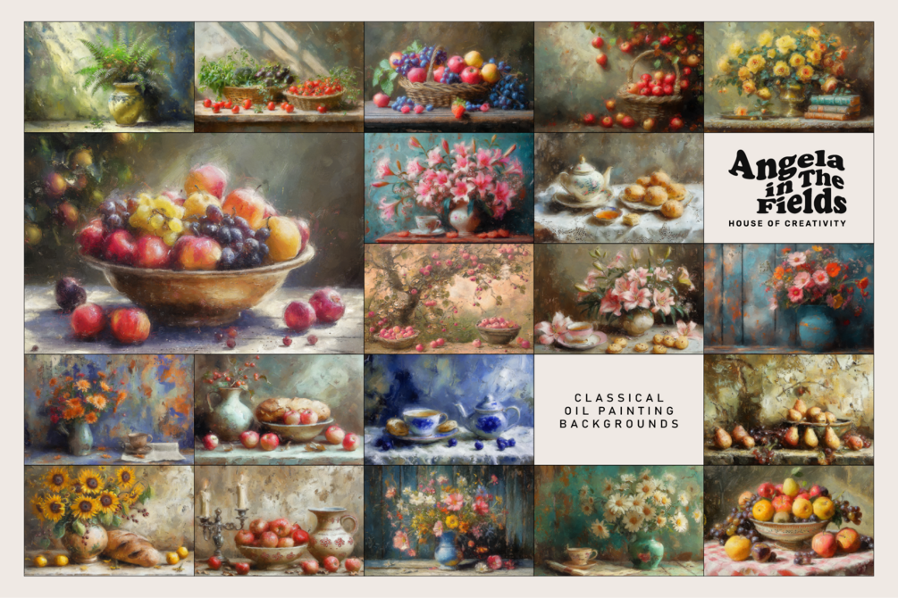 This chapter set includes 100 vintage themed impressionist still life paintings in landscape and portrait format in PNG (all images are 4000px width or height). Whimsical and nostalgic, they will be the perfect and elegant addition to your wall art, branding, packaging, social media or web products. You can also use it as a reference for your own designs!