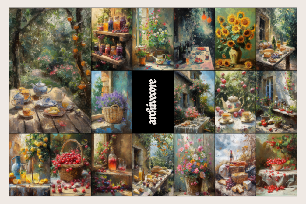 Tired of the same old vintage graphics out there? Here's your solution. Partnered with Archivecore, this is an experiment in mixing nostalgia with technology; a gorgeous pack of brushy still life paintings (inspired by the likes of Renoir and Monet), perfectly emulating the european summer & old money aesthetic we are all loving right now, but with a fresh, new take, making them almost abstract.