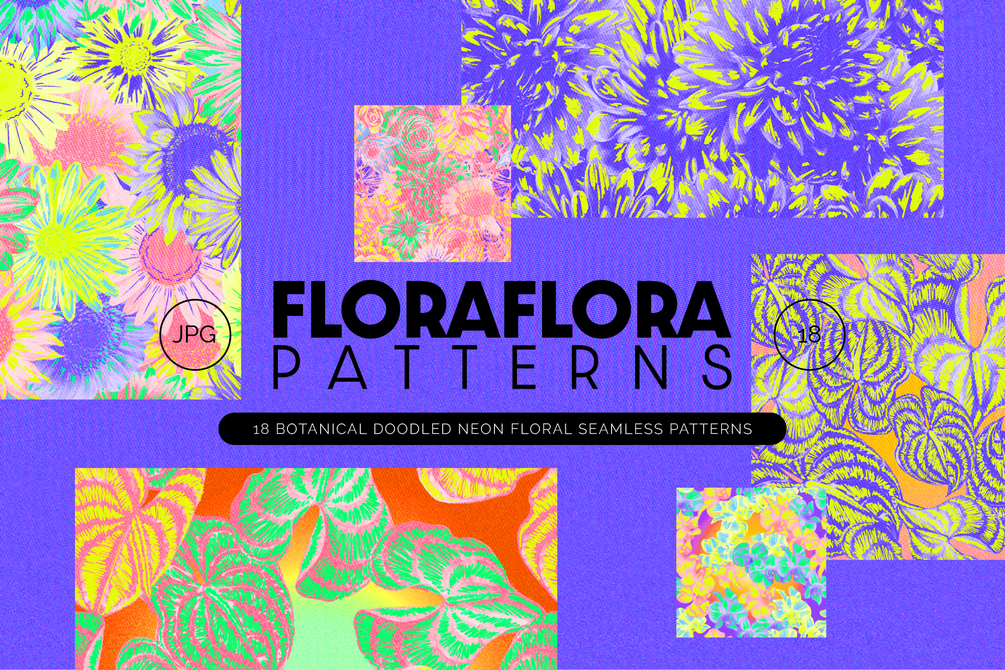Punchy, neon and the epitome of maximalism, this pattern set will perfectly compliment any product you are trying to zhush up and launch into the new era. Made up of my Flora Flora elements (which you can find in my shop), it harks back to those questionable acidy floral 80s graphics we love and adore.