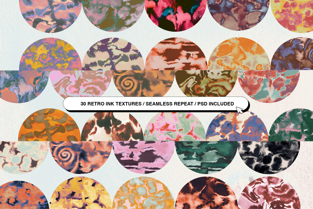 In this set you will find 30 awesome ink seamless textures (at a massive size of 7818x6291px) in both flat JPG tiles as well as PSDs with colour gradient overlays, if you'd like to play around and tweak the colours.
