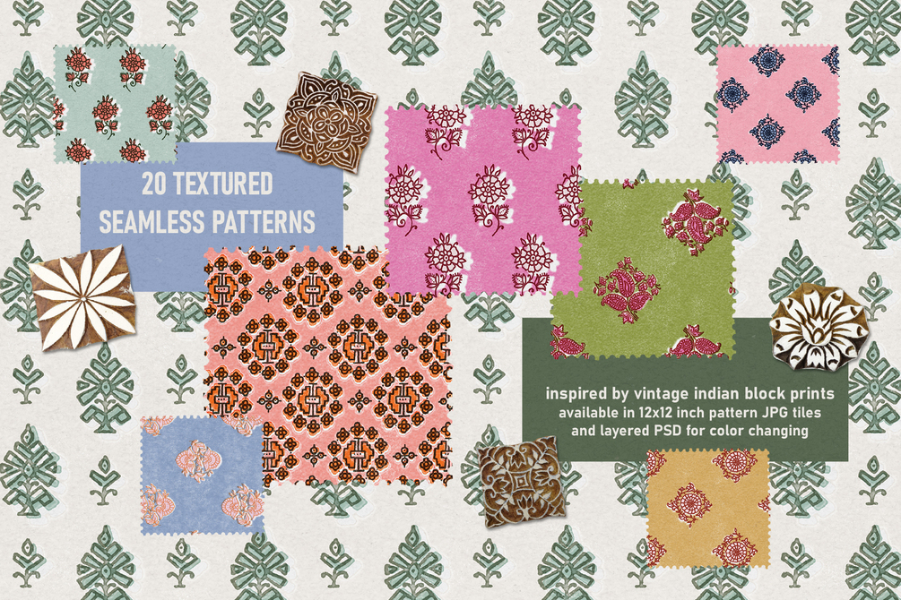 Introducing Bombay Summer —a curated collection featuring 20 block print-inspired retro patterns. Dive into a world of timeless design, where organic shapes and rich print textures come together in a vibrant vintage color palette. Elevate your branding, social media, or products with these effortlessly chic patterns that capture the essence of summer.